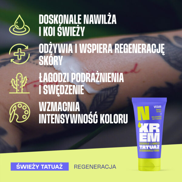 Dlatego stworzyliśmy krem do pielęgnacji świeżego tatuażu, który zapewnia skórze regenerację i pielęgnację oraz doskonałe nawilżenie i delikatne natłuszczenie. Ponadto nadaje skórze miękkości, elastyczności i ujędrnia!